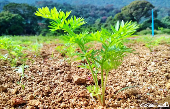 Troops serving the Sri Lanka Army Corps of Agriculture and Livestock (SLACAL) under the Directorate of Agriculture and Livestock (DAL) adding one more dimension to their cultivation of varieties of crops took to the cultivation of Carrot for the first time in a land patch of 3.5 acres under the Phase 1 at Dayagama a few days ago as per directions of Lieutenant General Vikum Liyanage, Commander of the Army who had already mobilized troops to support the government's national Food Security drive.