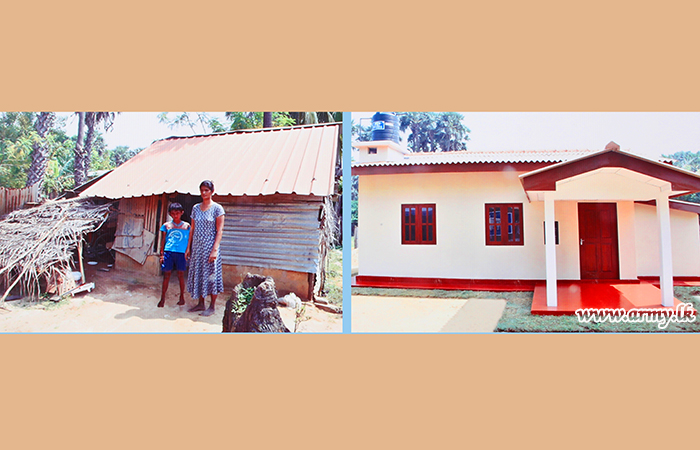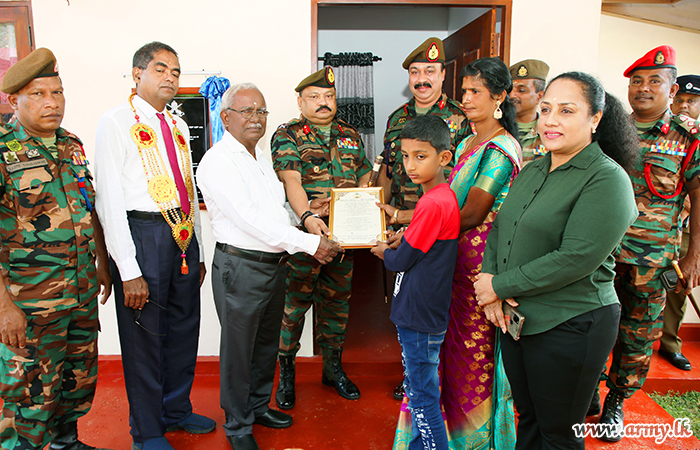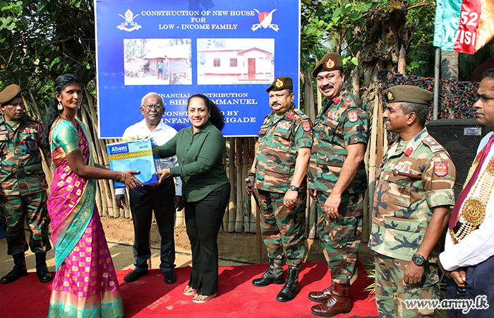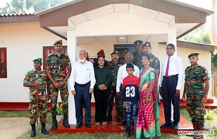 Giving a further stimulant to the ongoing house construction project of the Security Force Headquarters - Jaffna (SFHQ-J) for deserving civilians, 551 Infantry Brigade troops of the 55 Division erected one more new house for a needy family in the general area of Puloly-West Point Pedro and vested it in the beneficiaries during a ceremony on Wednesday (23), headed by Major General Chandana Wijayasundara, Commander, Security Forces - Jaffna.