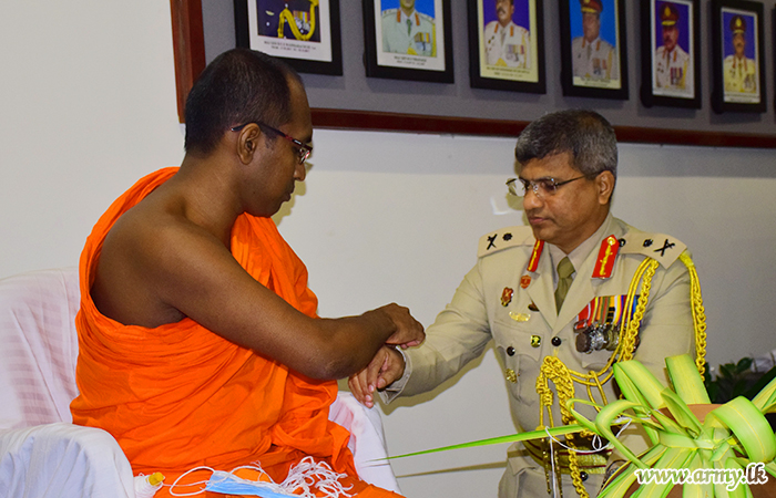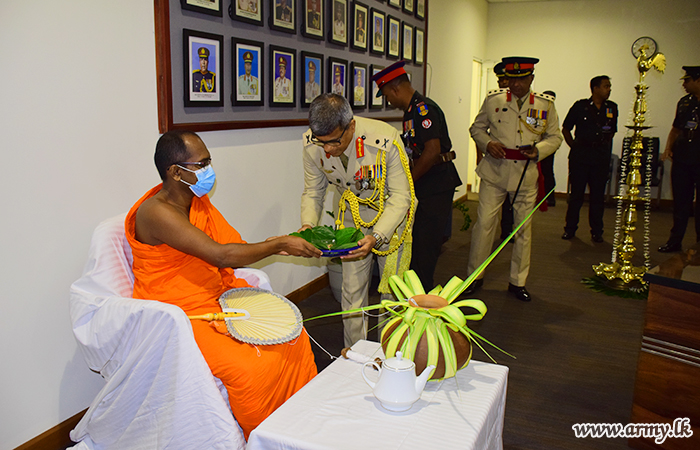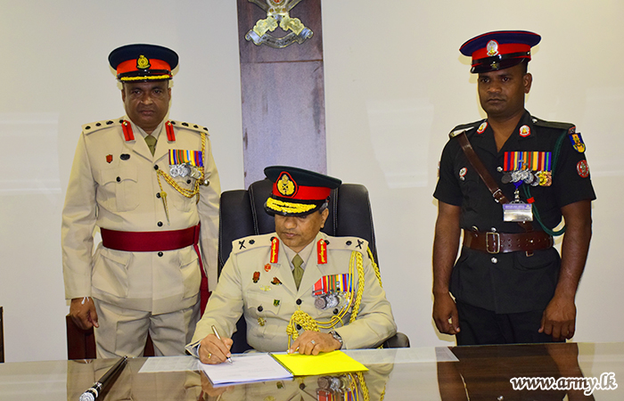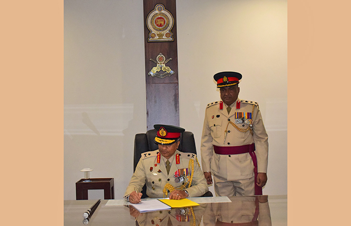 Upon arrival at his office, the newly-appointed Quarter Master General left his signature for an official document, signifying the acceptance of his new office amid chanting of 'Seth Pirith' by members of the Maha Sangha.