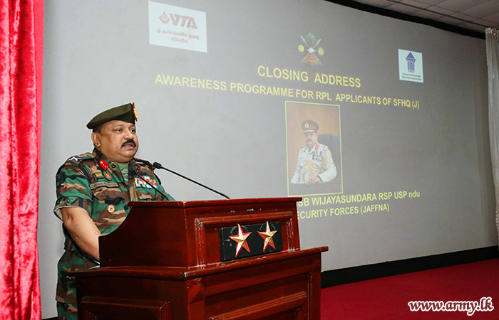 A three-tier programme to identify potential candidates among Army personnel for NVQ 3 and NVQ 4 qualifications got underway during 26-28 November at the Security Force HQ-Jaffna to be in line with the laid down RPL System (Recognition of Prior Learning) of the National Vocational Training Authority and Tertiary and Vocational Education Commission in response to a request, made by Major General Chandana Wijayasundera, Commander, Security Forces - Jaffna.