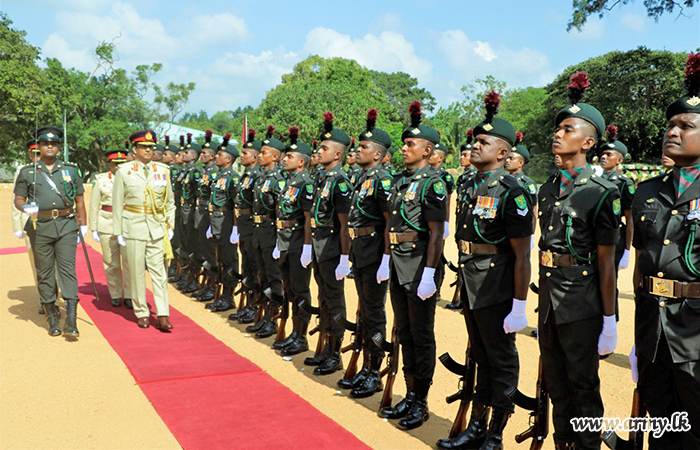 After a Guard Turnout salute to him at the entrance, the formal military ceremony at the Regimental Centre commenced after he was received by Major General Udaya Herath, General Officer Commanding, 61 Infantry Division along with Major General Janaka Priyadarshana, General Officer Commanding, 66 Infantry Division, Brigadier Kavinda Balasooriya, Commander, Mechanized Infantry Brigade and Brigadier Anura Abeysinghe, Centre Commandant, Mechanized Infantry Regiment.