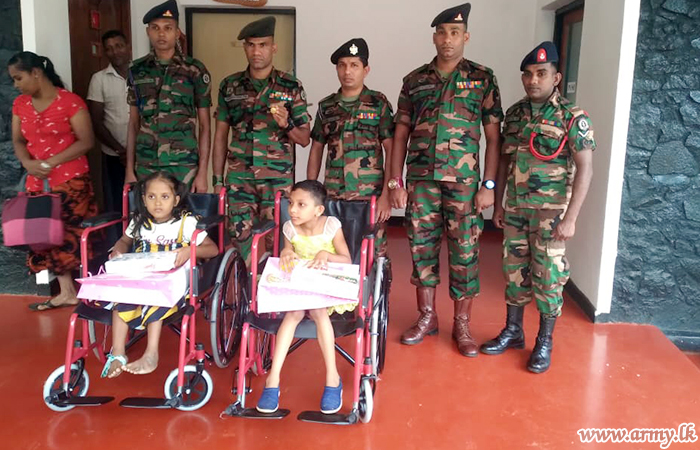 In a gesture of goodwill and understanding, the 532 Infantry Brigade troops on hearing of the difficulties faced by two physically-handicapped students in Samanalathenna and Ehalagama villages in Dehiattakandiya recently provided two wheelchairs and a stock of school equipment to both of them with the sponsorship provided to the Brigade by one Mrs Gaya Meewella.