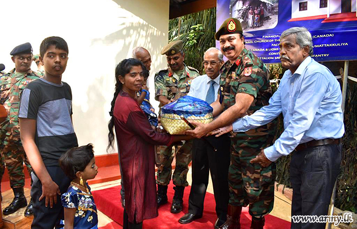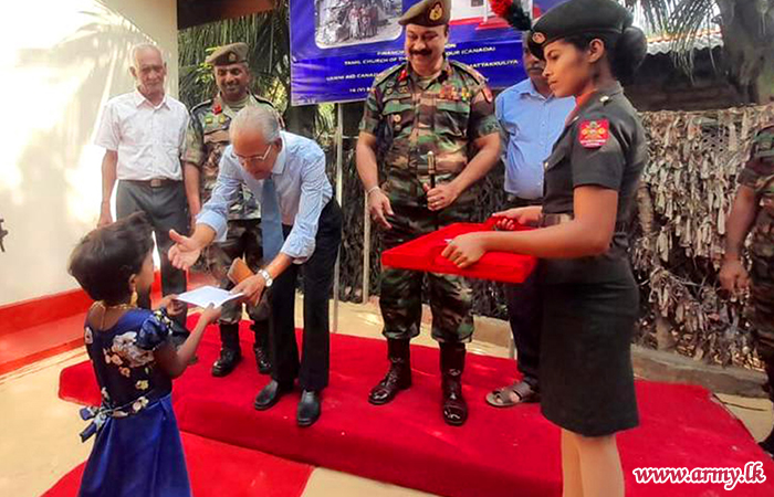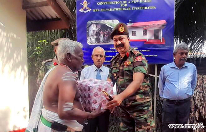 Mrs Selvartnam Jeyappirata, who has been living under extremely difficult circumstances was the beneficiary of the new home, built by the troops. Major General Ravi Rathnasingham (Retd) coordinated the funds allocated to the Army by the Tamil Church of Living Savior in Canada.
