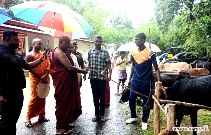 The Commander, Security Forces - East Major General Sujeewa Hettiarachchi provided guidance to the mammoth project., The overlooking General Officer Commanding - 24 Infantry Division and Commander 242 Infantry Brigade Brigadier Anurudda Solangaarachchi closely supervised the project. The Commander 241 Infantry Brigade, Colonel Danika Pathirathna and the Civil Affairs Officer of the 24 Infantry Division and troops of the 16 Battalion Sri Lanka National Guard organized the donation of both dry ration packets and cattle.