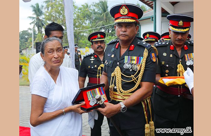 Seconds after, Major General Hirosha Wanigasekera presented the bereaved family with decorations and medals that had been earned by Major General Dammika Kariyawasam (Retd) during his illustrious career, a general tradition in the armed forces. The military funeral of late Major General Dammika Kariyawasam (Retd) was organized under the direct supervision of the office of the Army Adjutant General's Branch.