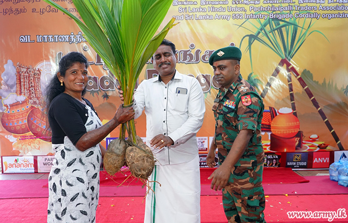 552 Infantry Brigade troops of the 55 Infantry Division under the Security Force Headquarters-Jaffna (SFHQ-J) launched a mammoth community-oriented project where donation of dry ration packs, school bags and stationeries, coconut saplings and cash gifts for winners in traditional games occurred on Monday (16) at the Public Bus Stand Premises, Pallai.
