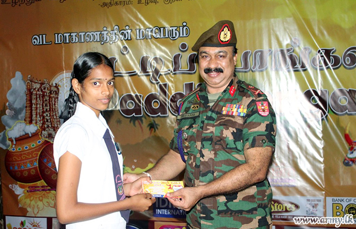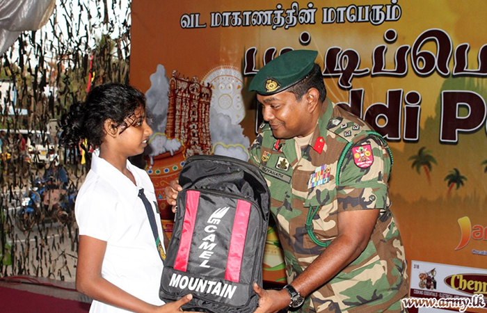 More than 500 villagers and children during the event received dry ration packs, 150 school bags, 500 coconut saplings and gift vouchers to the value of Rs 50,000.00 for distribution among winners in Thai Pongal traditional games on the same day. The entire stock cost Rs 8 lakhs for the donor, Mr S Madan. Troops afterwards assisted the distribution of those incentives among beneficiaries.