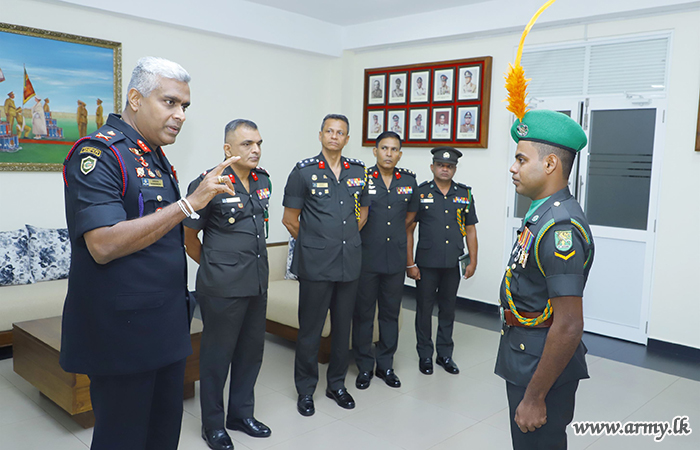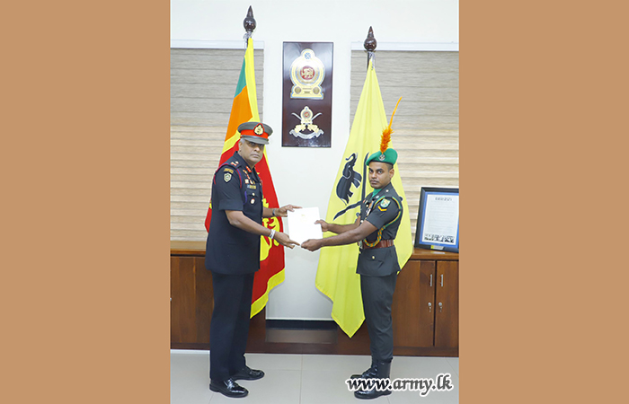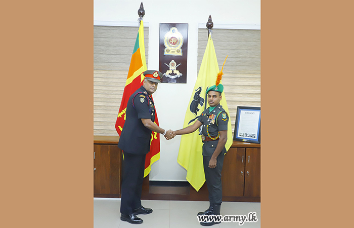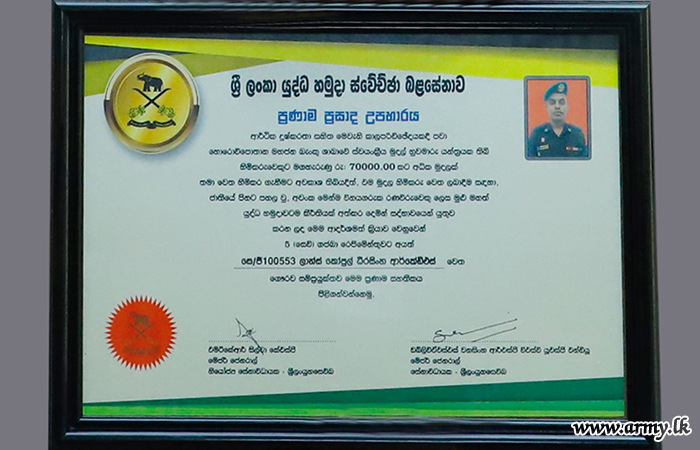 Major General Sanjaya Wanasinghe, Commandant, SLAVF after inviting the 'Good Samaritan' to his office praised him for his integrity and presented the ‘Pranama Prasada Upahara’ appreciative certificate in the presence of several Officers and Other Ranks. He has also been promoted to the next rank of Corporal on the recommendation of the SLAVF Commandant.