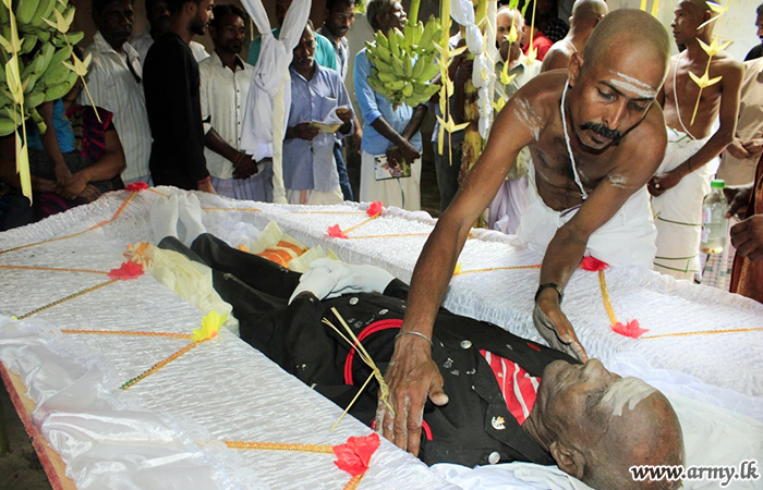 The military funeral of Private Velupillai Amaranadan (Retd) who had served in the 1 Ceylon Light Infantry Regiment in 1955 - 1967, took place on Sunday (14 May) at Kudamiyan cemetery in Kodikamam, amid a mammoth gathering of military personnel and civilians in the area.