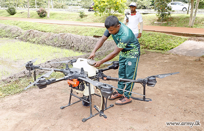 Accordingly, 3 representatives of Aerogeni (Pvt) Ltd arrived with their drones and equipment and demonstrated the techniques of spraying of insecticides and herbicides in the presence of the troops in the paddy-field patch, managed by 2 (V) SLACAL in Sri Jayawardenapura.