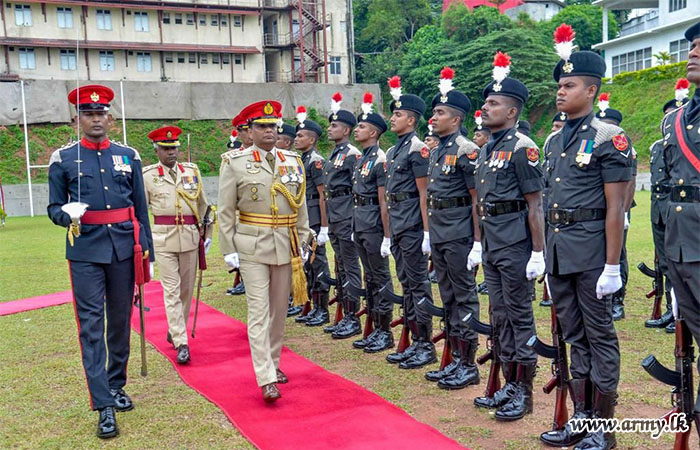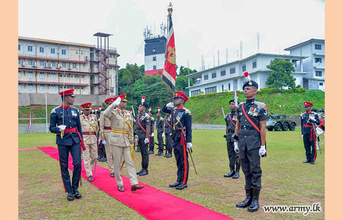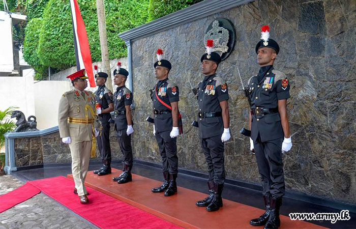 The newly-appointed Colonel Commandant was warmly welcomed by the Commanding Officer of 1st Reconnaissance Regiment of the SLAC at the entrance to the Home of Armour prior to his review of the Guard Turnout.