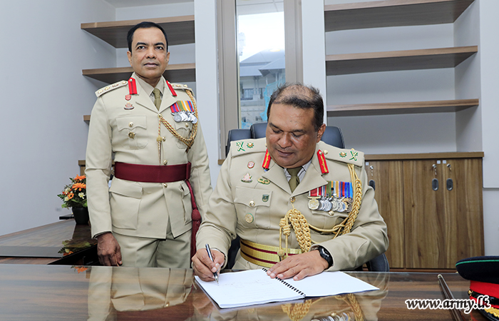 The incoming new Director General Infantry placed his official signature in an official document amid chanting of ‘Seth Pirith’ by the Maha Sangha signifying the acceptance of the new appointment soon after the symbolic oil lamp was lit by him, together with Senior Officers present at the occasion.