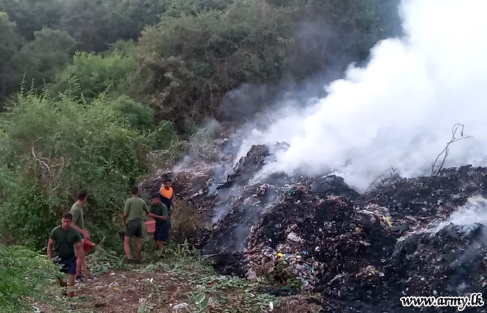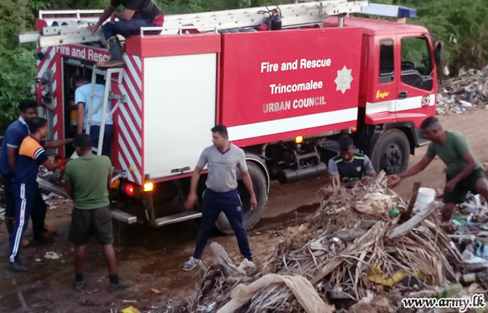 A sudden fire that occurred at about 4.30 pm on Thursday (22 June) at the garbage dumping site in the Trincomalee Municipal Council in Kanniya was brought under control by 22 Infantry Division troops with the support of Navy, Police, firemen in the fire brigade and civilians in the area.