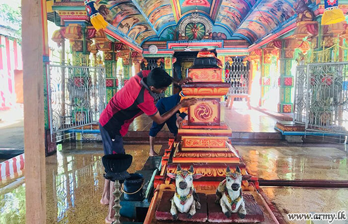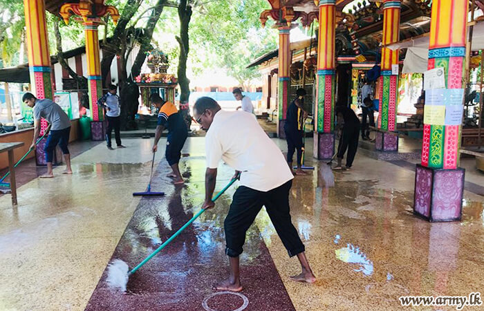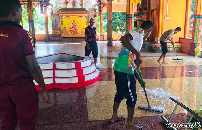 Just days ahead of the annual temple festival at Sri Ghanadurga Amman Kovil in Eluththumadduval North, Jaffna, 52 Infantry Division troops under the Security Force HQ-Jaffna cleaned the temple compound on Thursday (29) during morning hours.
