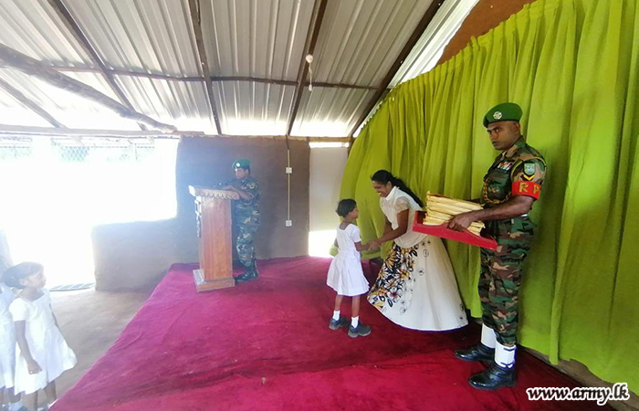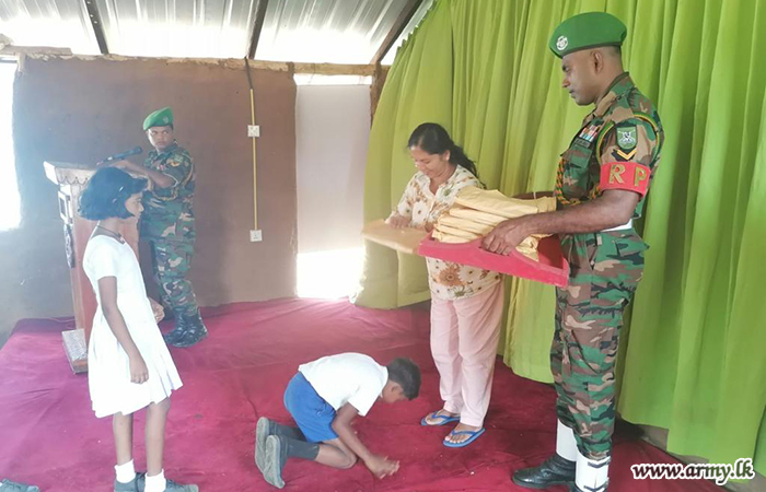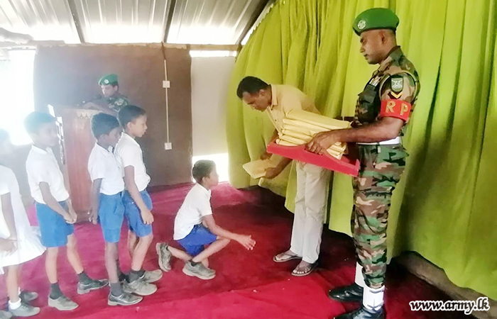 20 Gajaba Regiment (GR) of the 22 Infantry Brigade and 22 Infantry Division under the Security Force Headquarters - East through the generosity of a donor arranged a distribution of school accessories among students studying at Parana Medawachchiya Vidyalaya, Mahasenpura on Tuesday (04 July) at the school premises.