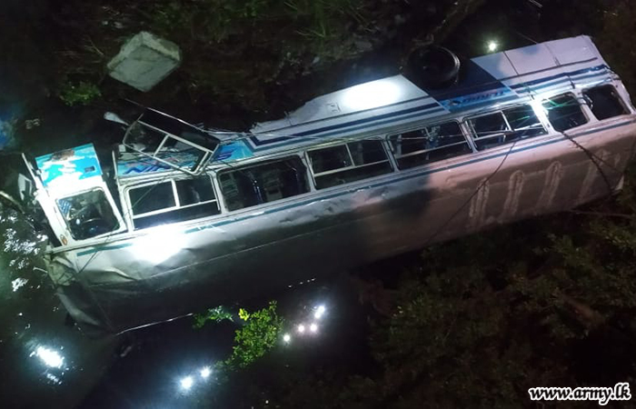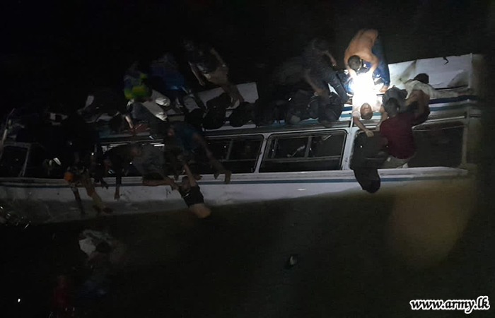 Army troops including those from the 12 Gemunu Watch and Sri Lanka Corps of Military Police near Kotaleeya bridge in Manampitiya were the first to rush and began rescuing the bus passengers fallen into the ‘Kotaliya Oya’ water passage last evening (9) around 7.30 p.m.