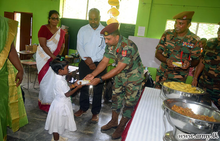 The Commander 513 Infantry Brigade, Major P.H.S.J Pathirange, Second in Command, 11 SLLI, Commanding Officer, 11 SLLI, Troops, Teachers and Students at WadduKarthikanya Primary School participated in the formal warming of the Army-built new classroom.