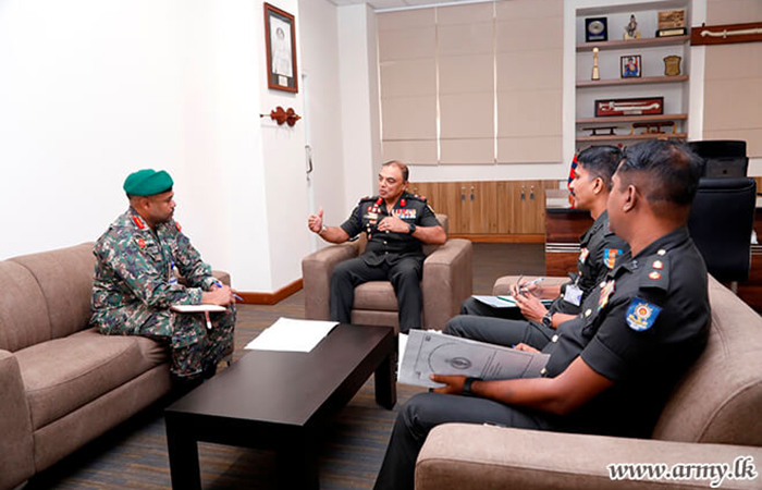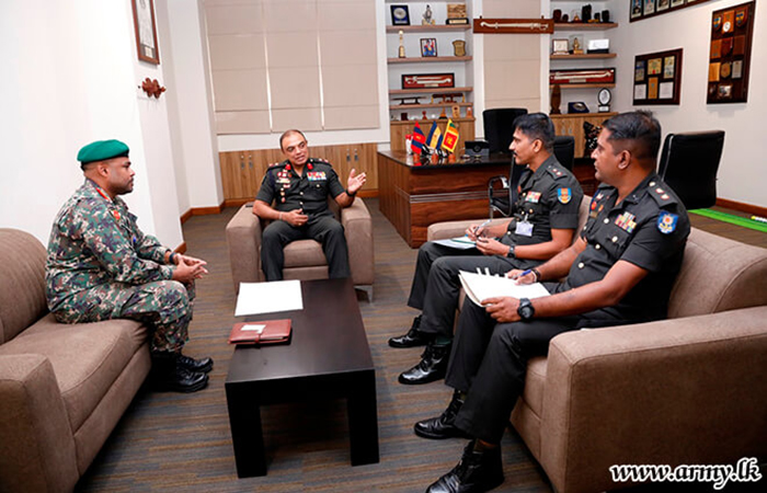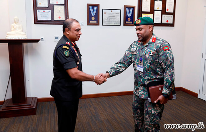 Colonel Hassan Amir, Defence Advisor to the High Commission of the Republic of Maldives in Colombo met with the Chief Field Engineer of Sri Lanka Army, Major General A.H.L.G Amarapala RWP RSP ndc psc on Monday (24) at the Army Headquarters.