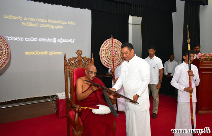 The Dimbulagala Buddhist Association in recognition of dedicated services being performed by Major General U.D Wijesekera RWP RSP USP rcds psc, Commander, Security Forces-East conferred the honorary title, 'Janajaya Sadana Samaggha Sri Deshabandu' on him during a ceremony held at Welikanda Cultural Centre on Sunday (30 July).