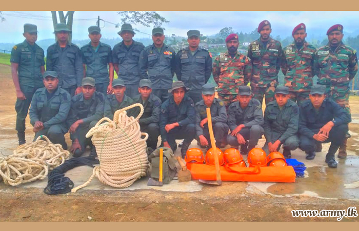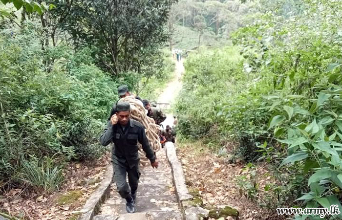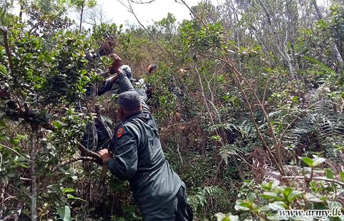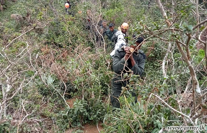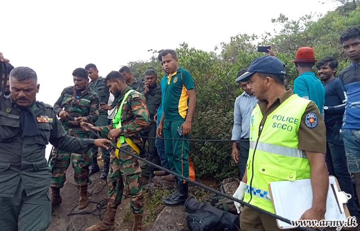 3 Sri Lanka Sinha Regiment troops with a team of Commandos of the 112 Infantry Brigade at the request of Lindula Police Station, Talawakele on Wednesday (2) early morning rushed to popular Great Western mountain cliff area and began removing the dead body of an unknown woman, believed to have fallen off the mountain and died several hours or days ago.