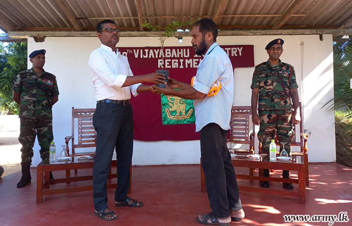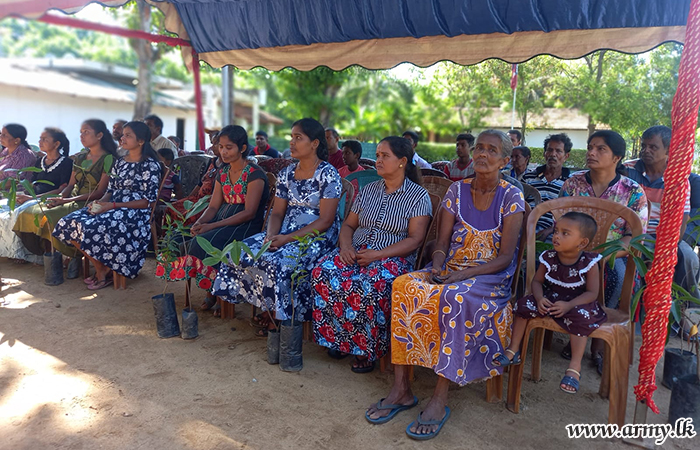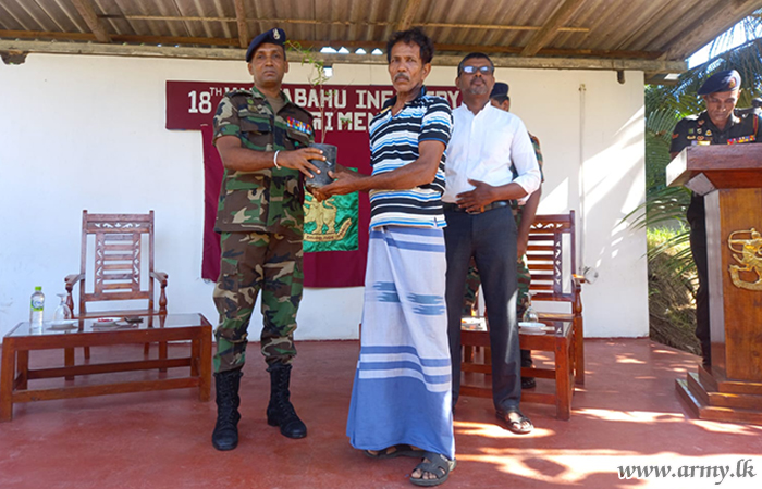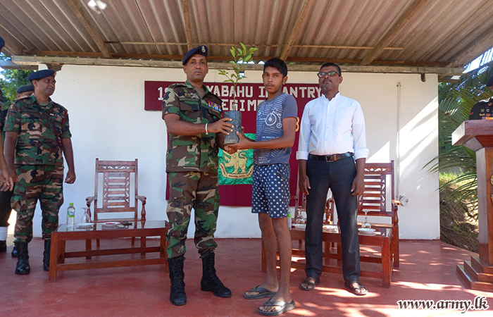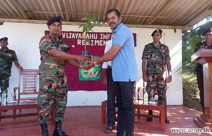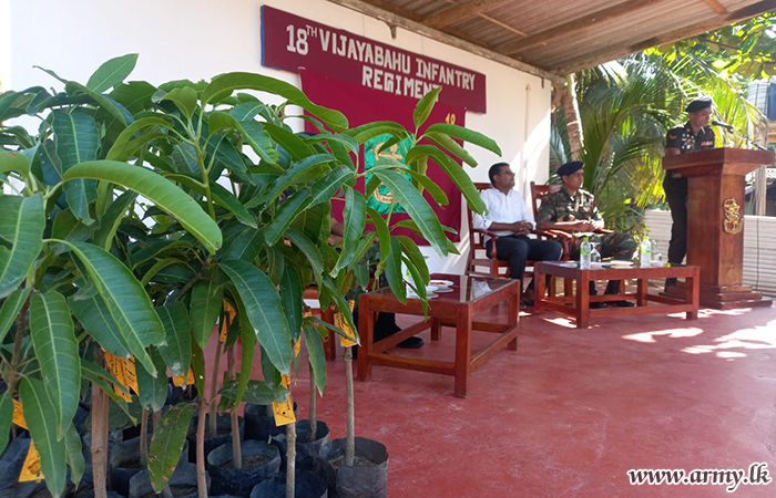 18 Battalion Vijayabahu Infantry Regiment (18 VIR) troops with the objective of encouraging cultivation of cash crops distributed hundreds of mango, orange, pomegranate and rose apple saplings among low-income group families, resident in Kalmunai area on Saturday (12 August) after inviting them to the 18 VIR camp premises.