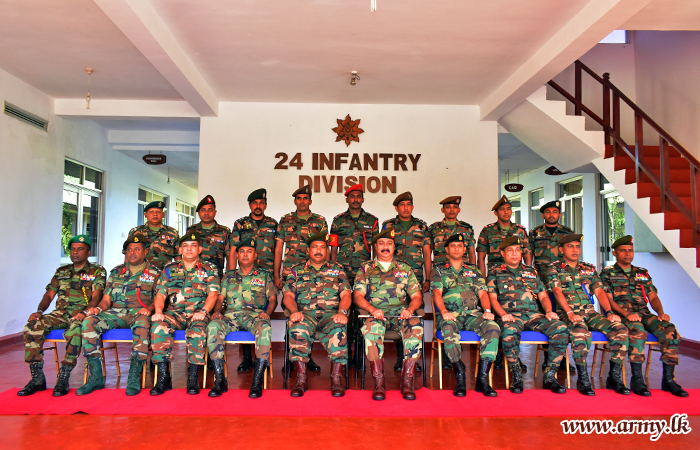 On 21 August, the General Officer Commanding (GOC), Major General W Chandrasiri RSP USP psc of the 24 Infantry Division and all officers warmly welcomed Major General M.K.U.P Gunaratne RSP ndu psc IG on his arrival at the 24 Infantry Division premises after he was saluted in a Guard Turnout. Later, he addressed the troops under the 24 Infantry Division.