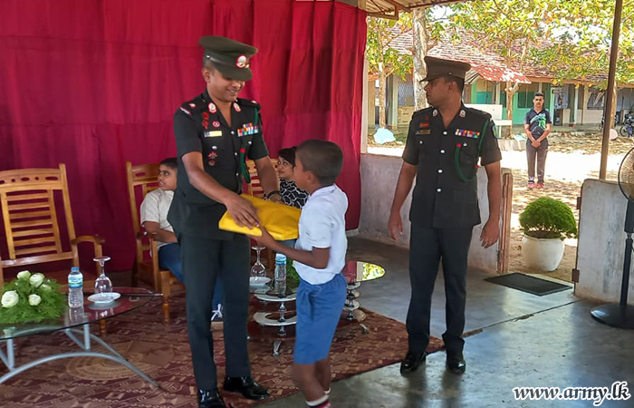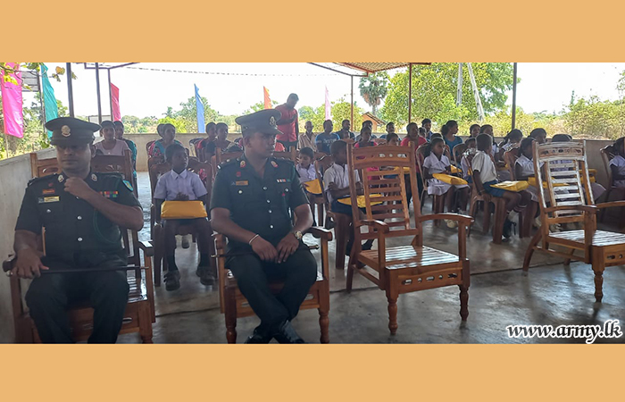 Troops of the 4 Gemunu Watch (4 GW) under the 232 Infantry Brigade organized the event where students in primary classes (Grade 1-5) were the beneficiaries. Each pack, worth Rs. 2500/= contained instruments, pencils, exercise books, drawing pencils, etc.