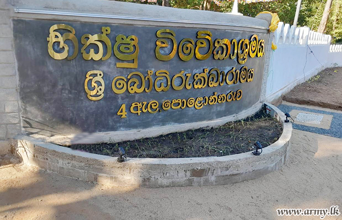 Troops of the 23 Infantry Division under command to the Security Force Headquarters -East after all repairs and renovations were done to the Bodirukkarama Viharaya in 4 Canal (Hatara Ela) area put up the name board of the temple and vested it in the incumbent of the Bodirukkarama Viharaya on 25 August.