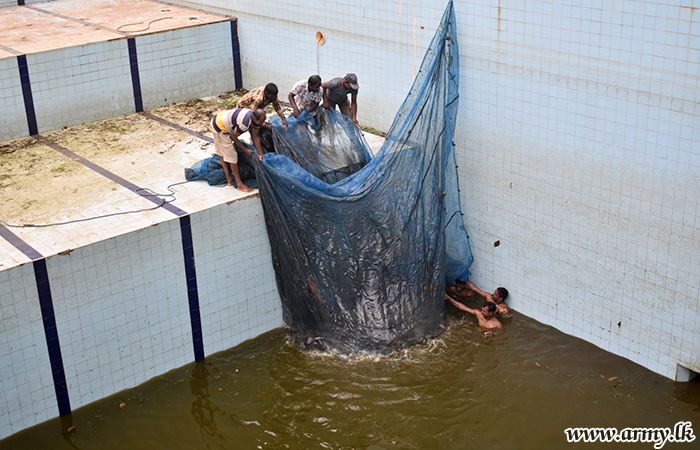 Troops of the 68 Infantry Division as per instructions given by Major General S. Kasthurimudali RSP ndc psc, General Officer Commanding, 68 Infantry Division in cooperation with the National Aquaculture Development Authority (NAQDA), Kilinochchi branch made use of the LTTE terrorists' former Sea Tiger Diving Pool to breed the fingerlings before they were released.