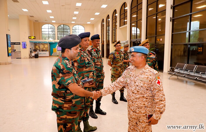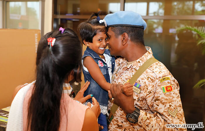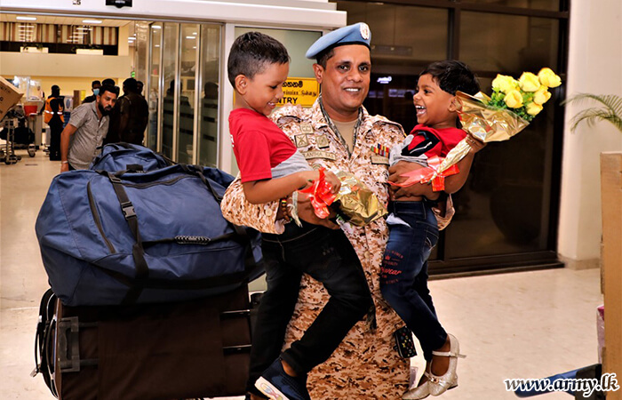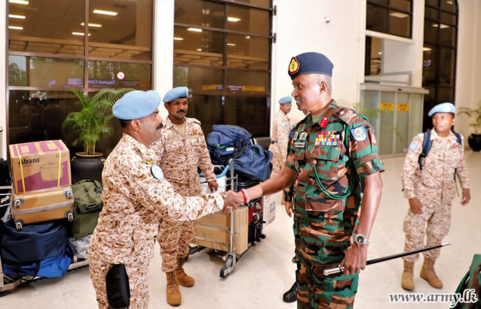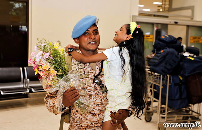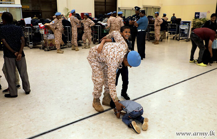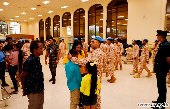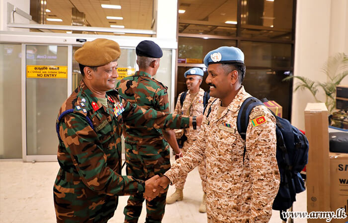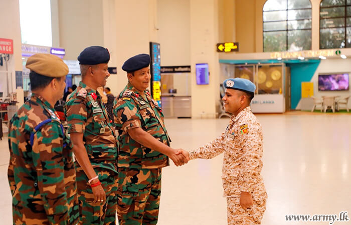 Major General S. Kasthurimudali RSP ndc psc, General Officer Commanding of 68 Infantry Division, Brigadier W.B.J.K Wimalaratne RWP RSP, Centre Commandant of Gemunu Watch, Brigadier G.L.S.W Liyanage USP psc, Director, Directorate of Overseas Operations with several Officers and relatives were at the Bandaranaike International Airport to receive the returnees.