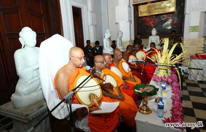 Flags were subsequently delivered to the monks in charge of the Thewawa at the upper chamber where chanting of Seth Pirith and conduct of religious observances afterwards invoked blessings on the Army’s long journey.