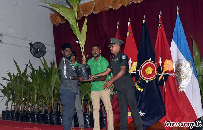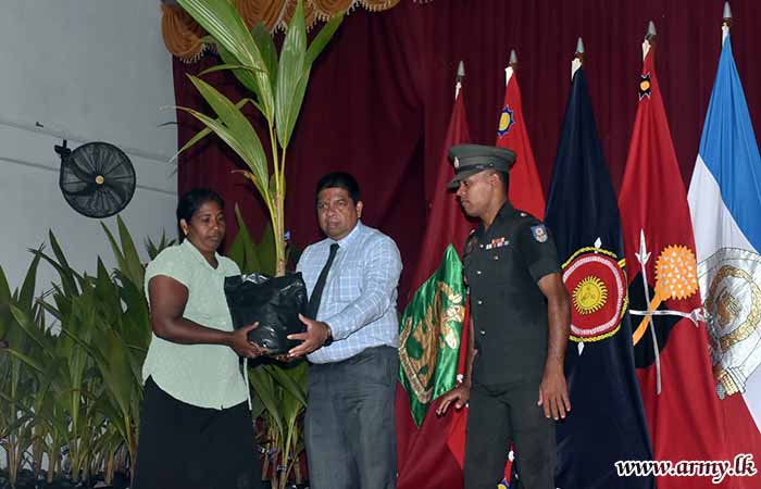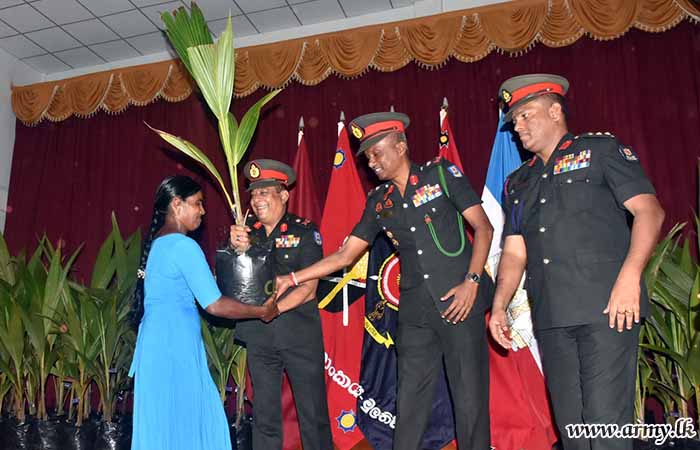 The 68 Infantry Division HQ under the Security Force HQ - Mullaittivu (SFHQ-MLT) with the motive of further improving the livelihood of low income group families gave away 1850 coconut saplings among 300 Mullaittivu civilians on Sunday (3 September) after inviting the beneficiaries to the Puthukkudiyiruppu Central College, coincident with the World Coconut Cultivation Day.