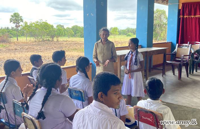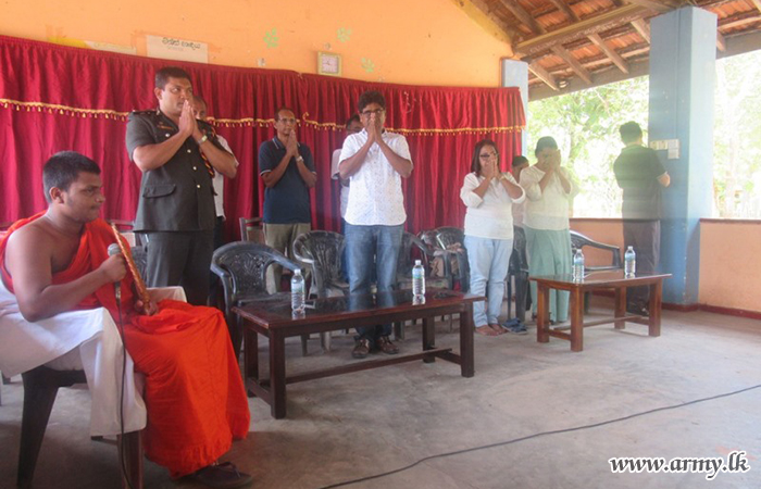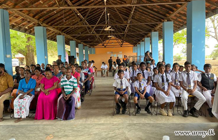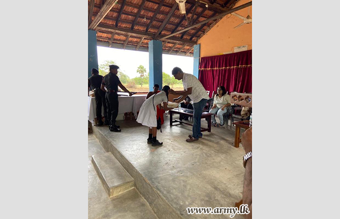Troops at the Centre for Army Vocational Training (CAVT) in Kala Oya with the support given by donors gifted school accessories to 30 needy students living in Kalaoya, Munamalgaswewa area on 2 September at Munamalgaswewa Primary School.