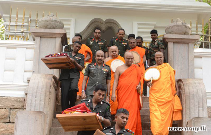 Those flags were afterwards respectfully handed over to the Commander of the Army for placement at the foot of the most sacred Jaya Sri Maha Bodhiya in the upper layer for symbolic blessings after laying flowers.