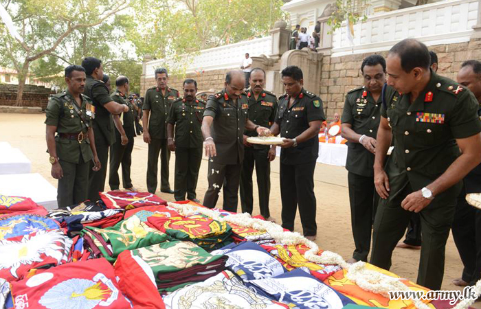 After the flags were laid on a bed of sweet jasmine and lotus flowers at the foot of the Sri Maha Bodhiya, members of the Maha Sangha began performing religious rites and chanted Seth Pirith, invoking blessings on the country’s indispensable Guardians of the Nation and extolled the Army’s contribution and dedication towards the motherland. A special Anushasana (oratory), made by the prelate on the occasion wished long life to the Army and its brave members.
