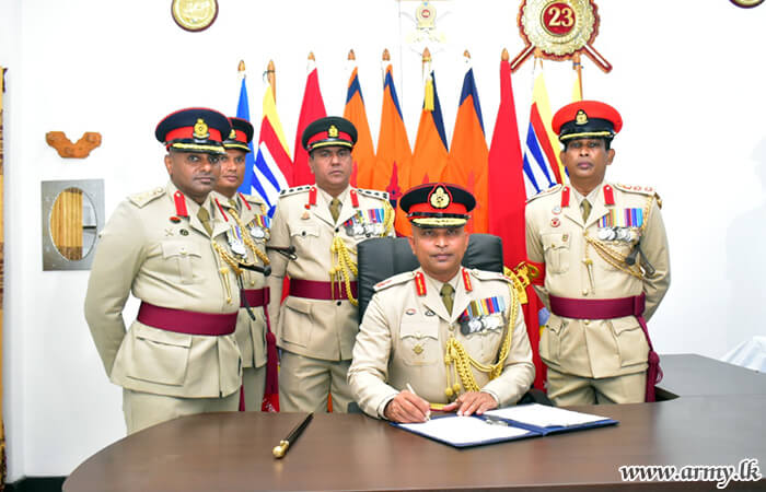 At the main entrance, the incoming GOC, 23 Infantry Division was presented a Guard Turnout salute by 9 Sri Lanka Artillery Regiment. Afterwards, the promoted General Officer Commanding was invited by the Staff Officers to plant a ‘Mango’ sapling in front of the Headquarter premises as a token of memory.