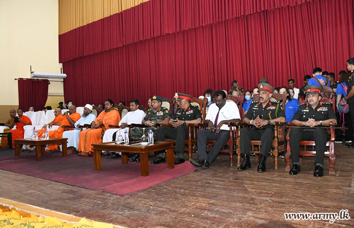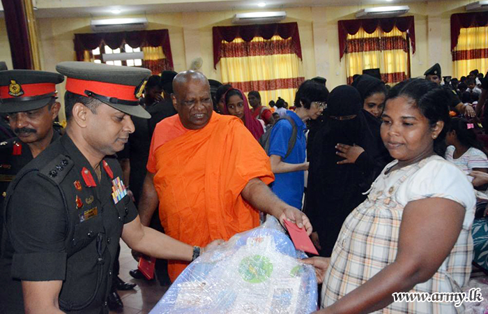 Representative Malaysian donors, together with their advisor after inviting beneficiaries to the Cultural Hall, Vavuniya distributed those relief packs to the students and those pregnant women along with the Commander, Security Forces - Wanni, Major General W.P.A.D.W Nanayakkara RSP VSV USP ndu, Major General H.G.P.M Kariyawasam RSP ndu psc IG, General Officer Commanding 56 Infantry Division, Brigadier General Staff, Commander 561 Infantry Brigade, Senior Officers, officers and other ranks.