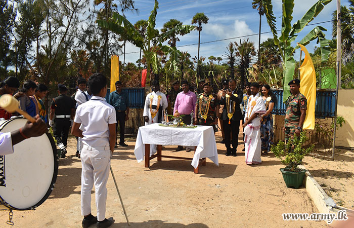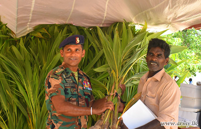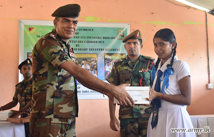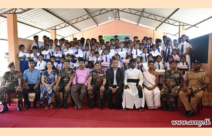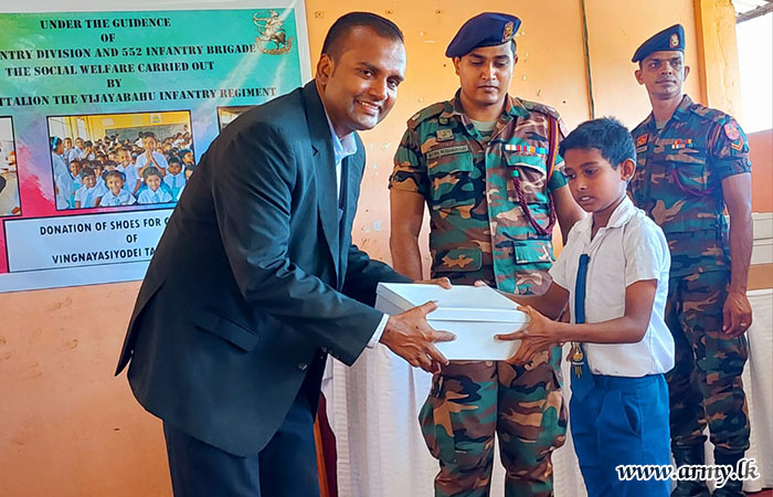 552 Infantry Brigade and 22 Vijayabahu Infantry Regiment troops of the 55 Infantry Division with sponsorship received from past Old Boys of Colombo Royal College and former graduates of the University of Sri Jayawardenepura distributed pairs of school shoes and coconut saplings among 100 students of Pooneryn Vinayasodei Tamil School and their parents on Monday (2 Oct) during a brief ceremony in the school premises.