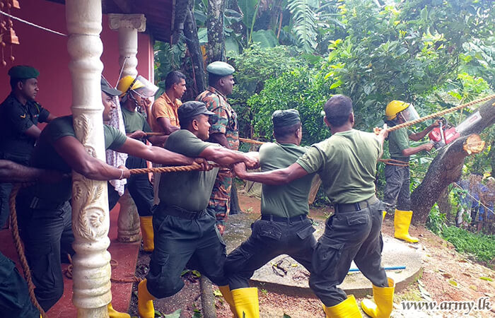 In response to a request of the Gampaha Divisional Secretariat, 141 Infantry Brigade troops serving under the Sector 15 moved swiftly and cleared several trees, about to fall on a house in Horagolla North Grama Niladhari Division in Ganemulla on Friday (6 October).