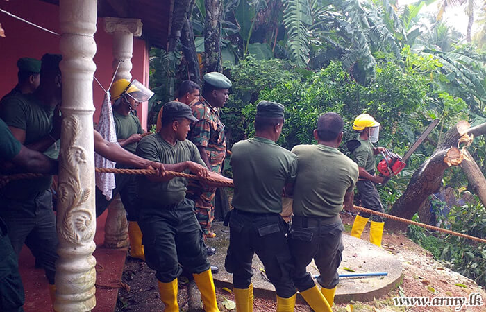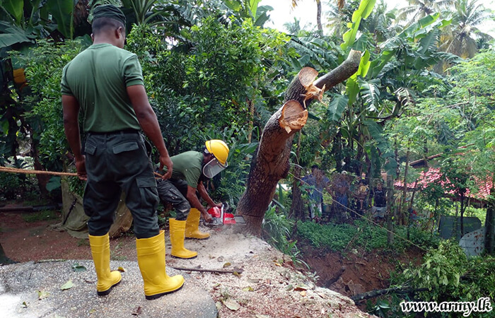 Due to inclement weather conditions and gushing winds, residents in the area fearing that their houses would be damaged as several trees behind the houses were swinging in the gushing winds complained to the nearest Division Secretariat which in turn sought the Army assistance for removal of those risky trees.