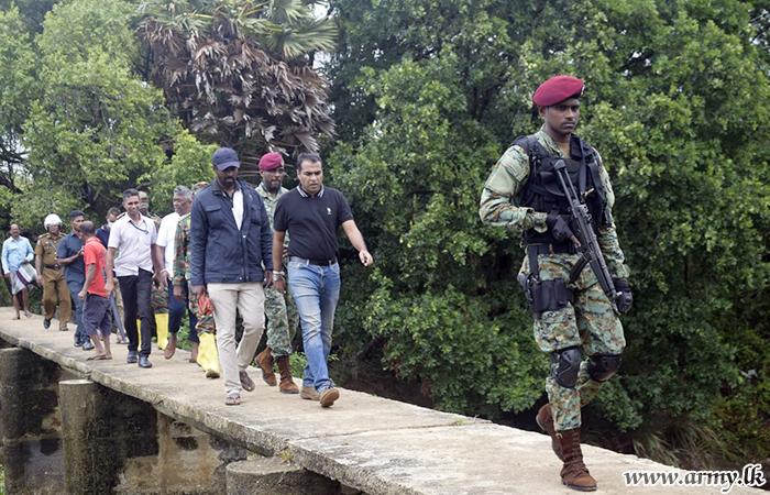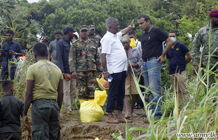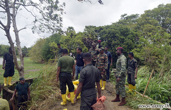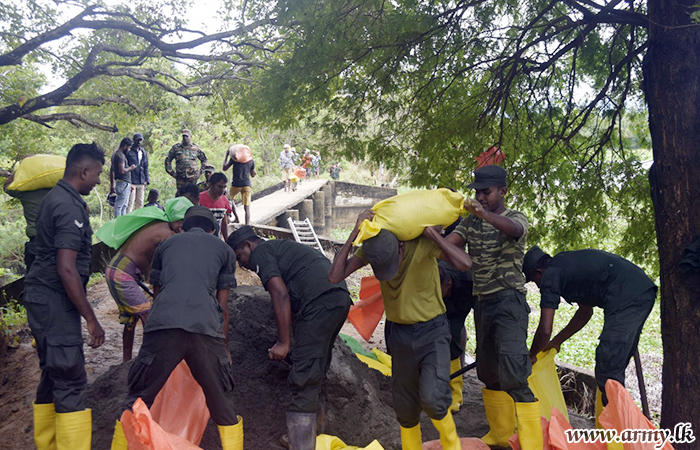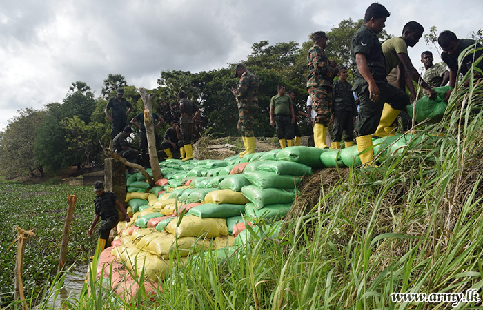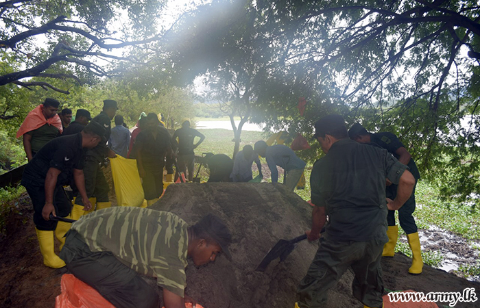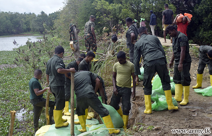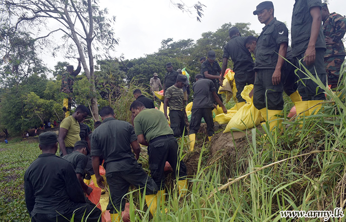 As soon as the troops received the news from the Disaster Management Centre of Galewela, troops rushed quickly to the location and started to place about 500 sandbags after hours of tiring work. Two Officers and 24 Other Ranks carried out the task under the close supervision of engineers of the Irrigation Department and averted a major disaster.