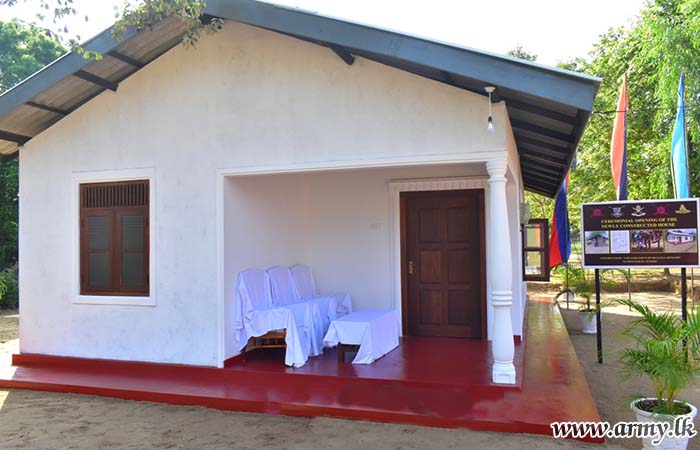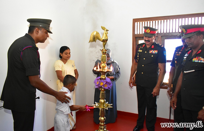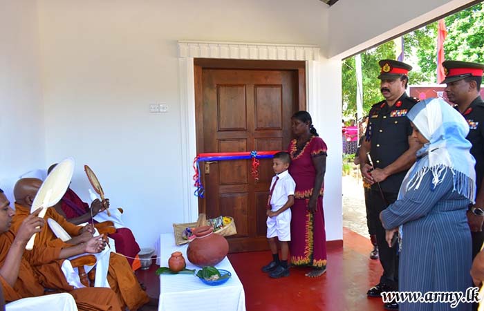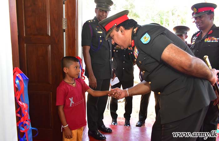 Troops on hearing of the pathetic plight of the minor and his grandmother took the initiative of erecting a new house on the 8th birthday of the poor boy and vested it in him and the grandmother on Wednesday (25). The sponsorship for the project was extended by donors and well-wishers at the request of the troops serving the area.