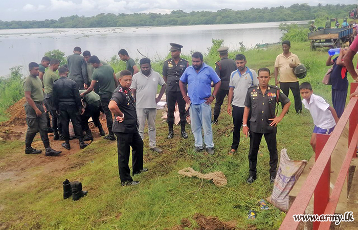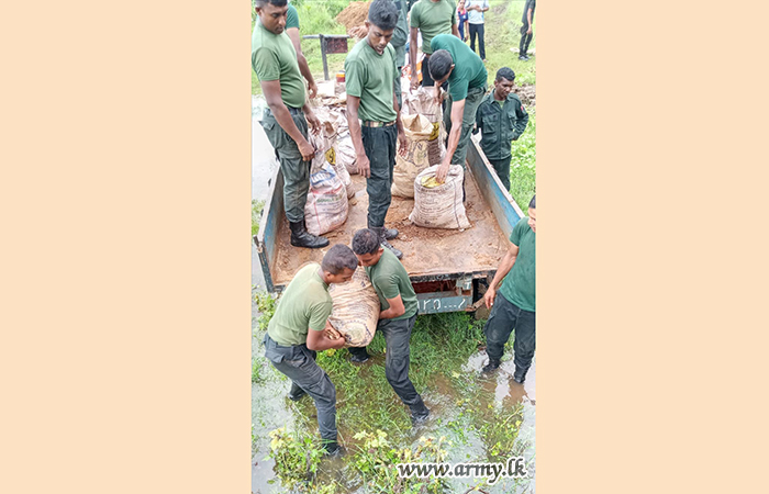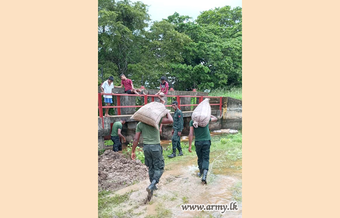 Accordingly, 2 (V) VIR troops placing sand bags on the threatened tank bund of the Keedawaramkulam tank prevented a major water leakage following the rise of rainy water levels in the tank.