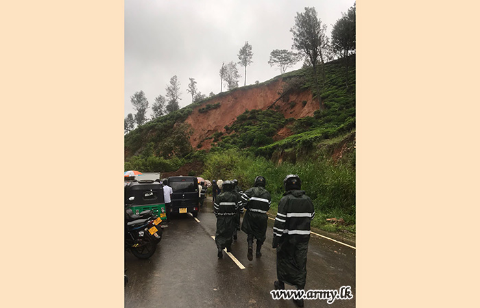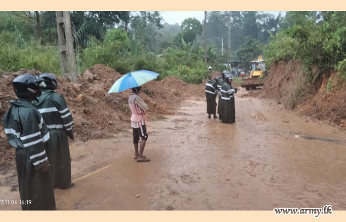 Torrential rains on the previous day (5 Nov) posed a threat of landslides in the affected area and a team of Army riders immediately alerted the civilians living around before a large soil mound and boulders fell on the road during small hours on Monday (6 Nov).