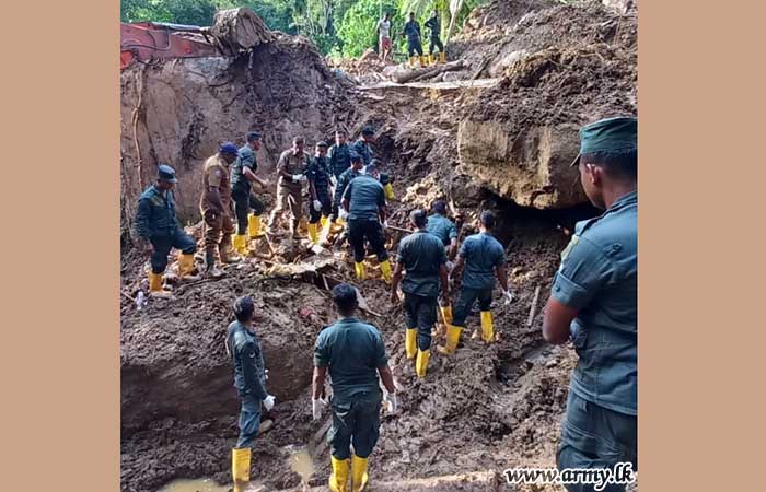 Following adverse weather conditions, the house with its four occupants, including two children were buried in soil causing a lanslide at the location and continued efforts since Sunday (12) night did not succeed in finding the whereabouts of those occupants. Troops despite bad weather conditions continued their rescue operations until the remains of those occupants were traced.