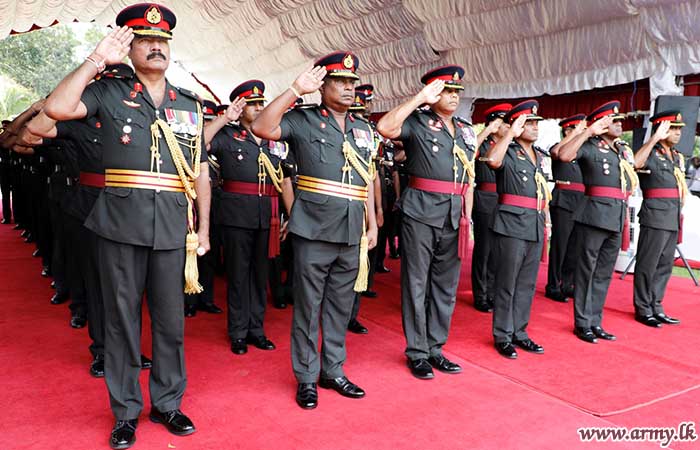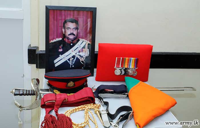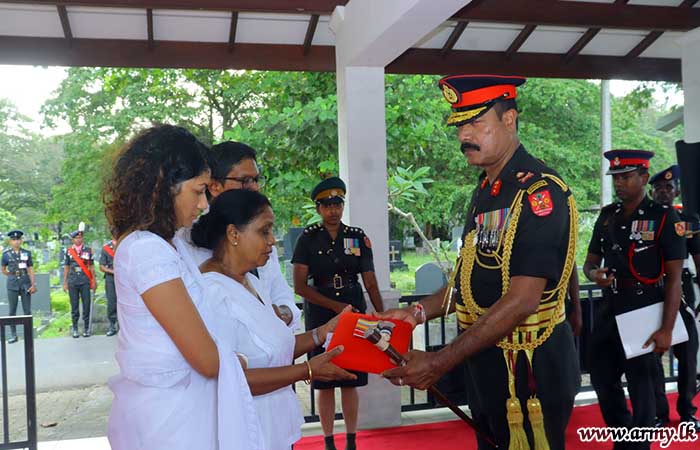 Seconds later, Major General S.R.K Hettiarachchi RWP RSP VSV USP ndu psc presented the bereaved family with decorations and medals Colonel W.M.R Wijesundara (Rtd) RWP RSP psc had earned during his illustrious career, a general tradition in the Armed Forces. Retired Senior Officers, serving Officers and mourners were also there to salute the late Officer as the dusk was falling.