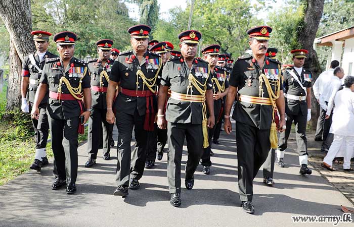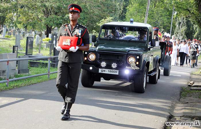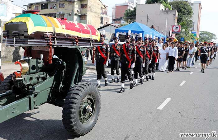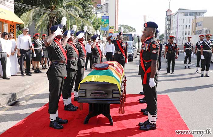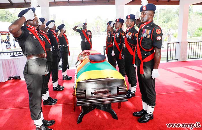 SLLI troops in accordance with military traditions received the remains, presenting arms near the entrance to the cemetery before being placed in the gun carriage having draped it in the National flag. As the funeral procession reached the main entrance to the cemetery, a representative gathering of Army soldiers formally received the coffin and began to inch their way towards the crematorium after all of them together with family members lined up behind the coffin.