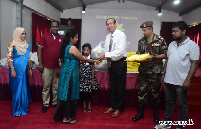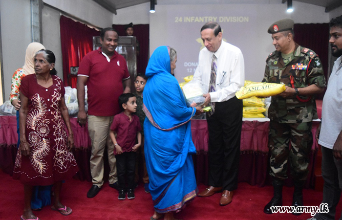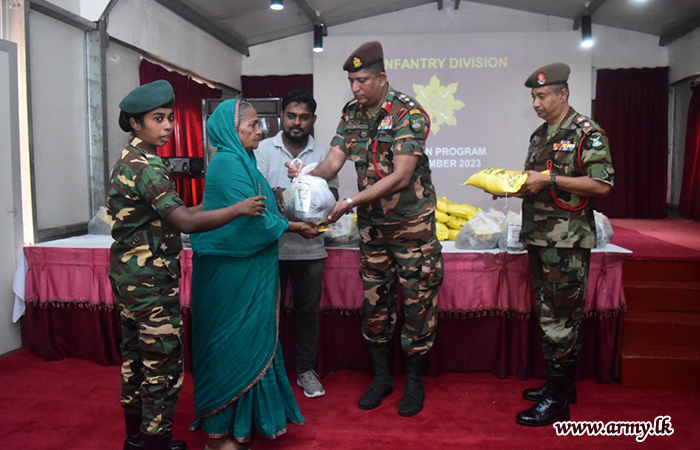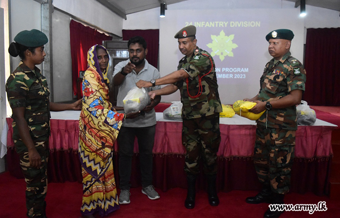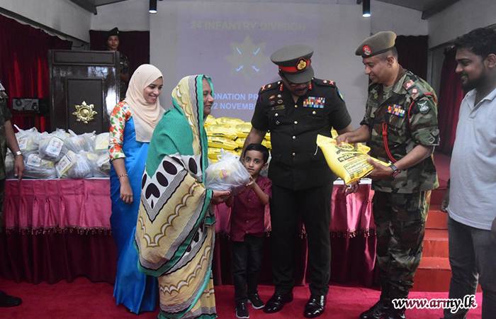Intended to give a helping hand to low-income group families, resident in Majeedpuram village in Samanthurai, Ampara, the 24 Infantry Division HQ on Sunday (12 November) with sponsorship received took steps to donate dry rations packs, each worth Rs. 3,500/= among 65 families after inviting them to the 24 Infantry Division HQ in Ampara.