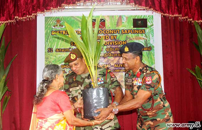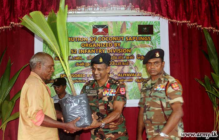 The owner of ‘S.K Farm’, Maruththakeni provided coconut saplings for free distribution at the request of the troops. The distribution was organized under the directions of the General Officer Commanding, 52 Infantry Division and Commander, 522 Infantry Brigade.