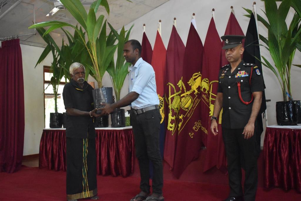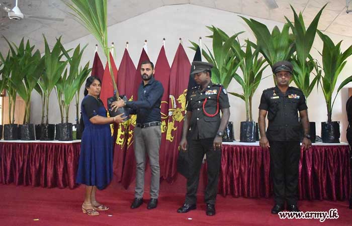 Giving an enhanced boost to its ongoing project for demarcation of the country's '2nd Coconut Triangle' in Mullaitivu, 64 Infantry Division troops under command to the Security Force HQ - Mullaittivu (SFHQ- MLT) launching its 2nd phase of the distribution gave away 2500 more coconut saplings to 40 selected families in Oddusuddan area in Mullaittivu on 23 November after inviting the beneficiaries to the 64 Infantry Division HQ premises.